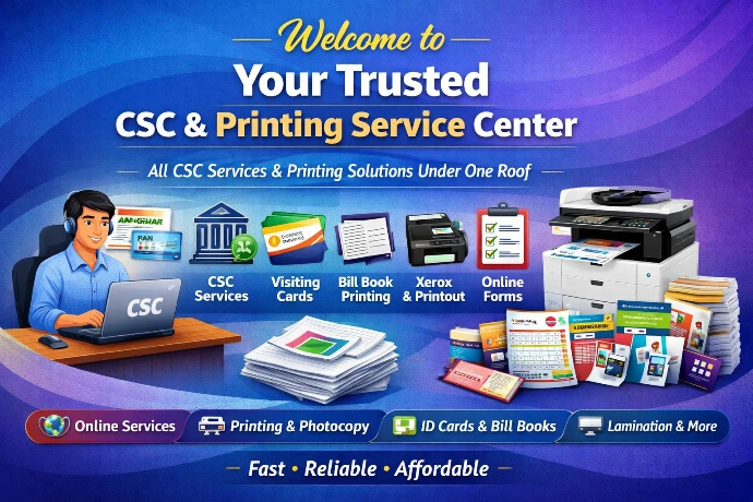 CSC Services, Online Form Filling, PAN Card Services, Printing & Photocopy, Visiting Cards, Bill Books, Scanning, Lamination, Resume Making & Digital Services.